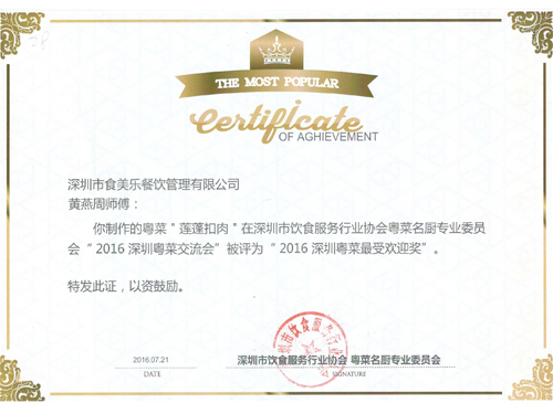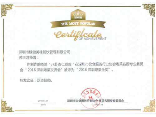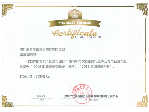 我司研发部丁总带队,携大厨苏玉洪、黄燕周参加了由深圳市饮食服务行业协会粤菜名厨专业委员会举办的“2016深圳粤菜交流会”。我司大厨苏玉洪制作的"八卦杏仁豆腐"、黄燕周制作的“如意虾灯”及“莲蓬扣肉”被评为2016年深圳粤菜金奖。